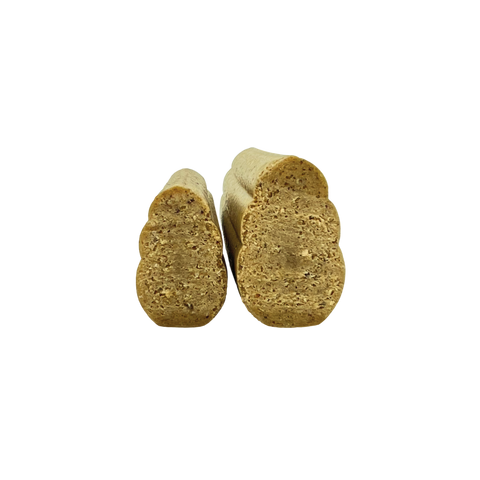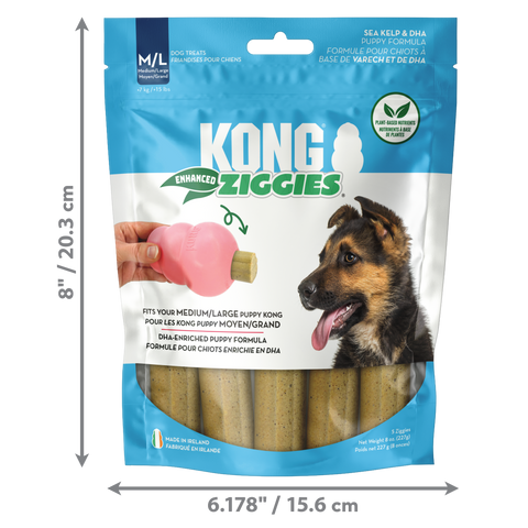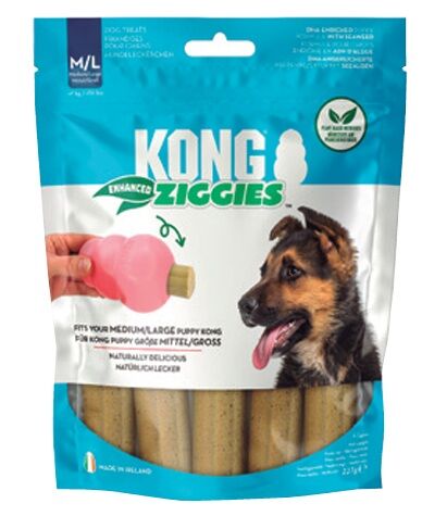 KONG Ziggies Enhanced Puppy are naturally delicious chews that support your pup's oral health. These puppy treats can help prevent plaque buildup and promote fresh breath while satisfying their chewing instincts. Enriched with DHA and sea kelp, Ziggies Enhanced Puppy contain important antioxidants, vitamins, minerals, and proteins. Ziggies are wonderful on their own or can be used to stuff inside Puppy KONGs and KONG Tires. Plus, these plant-based treats are free from wheat, corn, and soy, in case your puppy has specific allergies. You can help your pup soothe their teething pain by giving them a KONG stuffed with Ziggies Enhanced Puppy and topping it with Easy Treat!