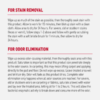 • For severe, old or stubborn stains (feces or vomit/hairball), follow steps 1-2 above and follow with gently scrubbing the stain with a soft bristle brush for 1 minute, then allow to dry for 24 hours