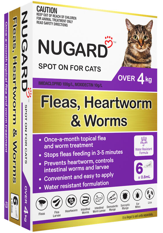 Nugard for Cats and Kittens is a monthly spot-on parasite treatment that rids your cat of fleas, flea larvae, ear mites and mange. It also protects your cat against most major intestinal worms, including roundworms, hookworms and whipworms, as well as deadly heartworm disease.