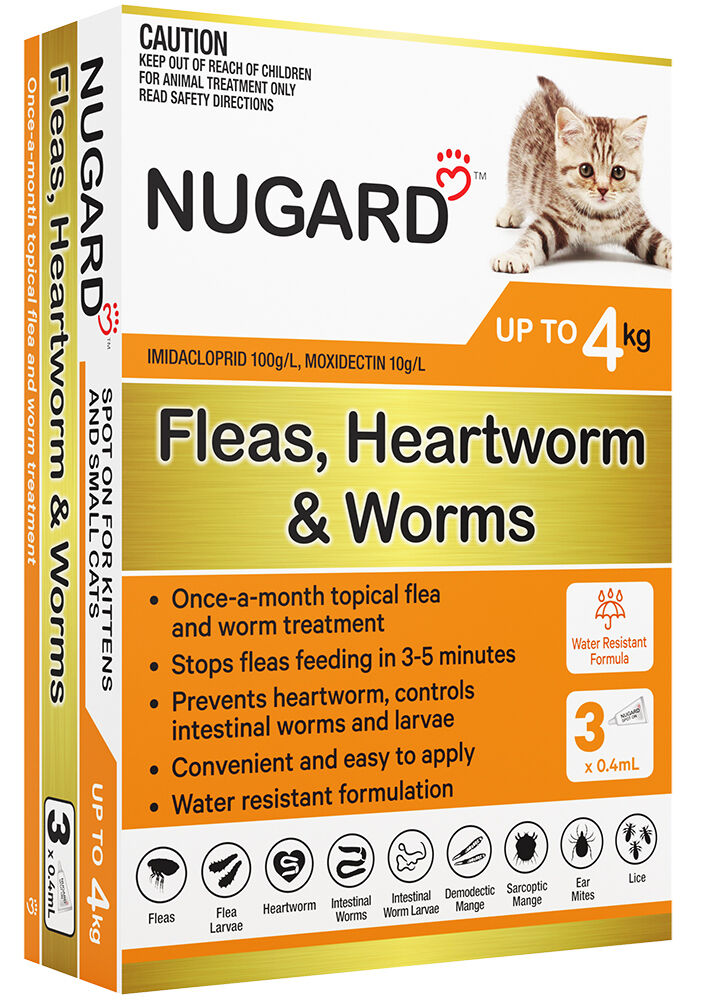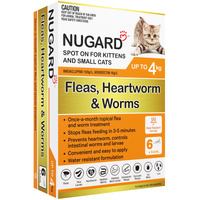 Nugard for Cats and Kittens is a monthly spot-on parasite treatment that rids your cat of fleas, flea larvae, ear mites and mange. It also protects your cat against most major intestinal worms, including roundworms, hookworms and whipworms, as well as deadly heartworm disease.
