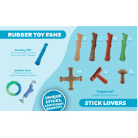 A safer alternative to chewing real wood sticks, Outward Hound's Dogwood product line has all the taste and texture of a natural tree branch but will last much longer for your beloved pup! With unique designs that add chew-worthy challenges, each variety provides unique benefits to match your dog's chew and play style – bringing long-lasting entertainment that satisfies your super chewer's urge to chew! Dogwood brings real wood to your dog's favorite durable chew toy to help keep dogs busy and entertained for long-lasting fun. With a variety of scents like the smell of real wood, bacon, beef, peanut butter, and more, these alternative chew toys are great for letting your dog work out their instinctual chewing behavior, help calm dog anxiety and stress, and help pups deal with teething gums. Plus, some versions feature ridges and grooves to help clean your dog's teeth while they chew. A win-win for your dog and you! Materials are made in the U.S.A. to ensure quality and care. Dogwood alternative wood chew stick varieties are also great for outdoor chew time and come in calming hemp, fresh breath mint, and even TPE versions for teething puppies! Available in multiple shapes, sizes, and scents, single packs to two-packs, there's a Dogwood chew toy for every dog, whether a puppy, small dog, medium dog, or large dog. Enjoy the durability, less mess, and chew satisfaction of the Dogwood by Outward Hound.