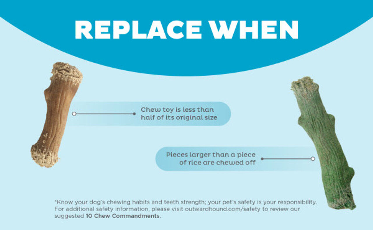 - Remove if chew toy is less than half of its original size or pieces larger than a piece of rice are chewed off.