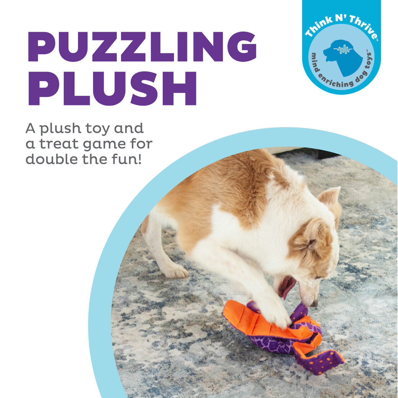 Nina Ottosson by Outward Hound Silly Legz plush dog puzzle combines a plush dog toy with a dog treat puzzle for brain-teasing fun your dog can't resist! This dog toy adds a mental challenge to your dog's playtime as they work to unroll the toy's legs and remove the dog treats from hidden pockets. They'll use their brain, paws, and nose to problem-solve and seek out the rewards. Even after the treats are gone, the toy's floppy shape and squeaker sounds maintain your dog's interest. Outward Hound Think N' Thrive mind enriching dog toys give treat-loving dogs a more fulfilling playtime that is mentally stimulating, physically engaging, and emotionally rewarding. Our toys allow dogs to act on their natural behaviors and use their minds, senses, and instincts to problem-solve and actively relieve stress while they play. Engage your dog's foraging and hunting instincts, promote mental enrichment, and ensure endless entertainment with the Nina Ottosson by Outward Hound Silly Legz plush dog puzzle.
