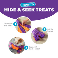 - Hide treats within the leg pockets and roll them up; dogs have to unroll the legs to access the treats