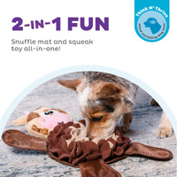Nina Ottosson by Outward Hound Snuffle Palz plush dog puzzle combines a plush dog toy, a non-slip snuffle mat, and a dog treat puzzle for brain-teasing fun your dog can't resist! This dog toy adds a mental challenge to your dog's playtime, stimulating their senses as they work to unwrap the toy's legs and remove the dog treats from the dog snuffle mat and hidden pockets. Place treats in the snuffle material and pockets, cover the mat with legs, and let your dog unleash their problem-solving skills. Even after the treats are gone, the plush material and squeaker sounds in the dog toy maintain your dog's interest. Outward Hound Think N' Thrive mind enriching dog toys give treat-loving dogs a more fulfilling playtime that is mentally stimulating, physically engaging, and emotionally rewarding. Our toys allow dogs to act on their natural behaviors and use their minds, senses, and instincts to problem-solve and actively relieve stress while they play. Engage your dog's foraging and hunting instincts, promote mental enrichment, and ensure endless entertainment with the Nina Ottosson by Outward Hound Snuffle Palz plush dog puzzle.