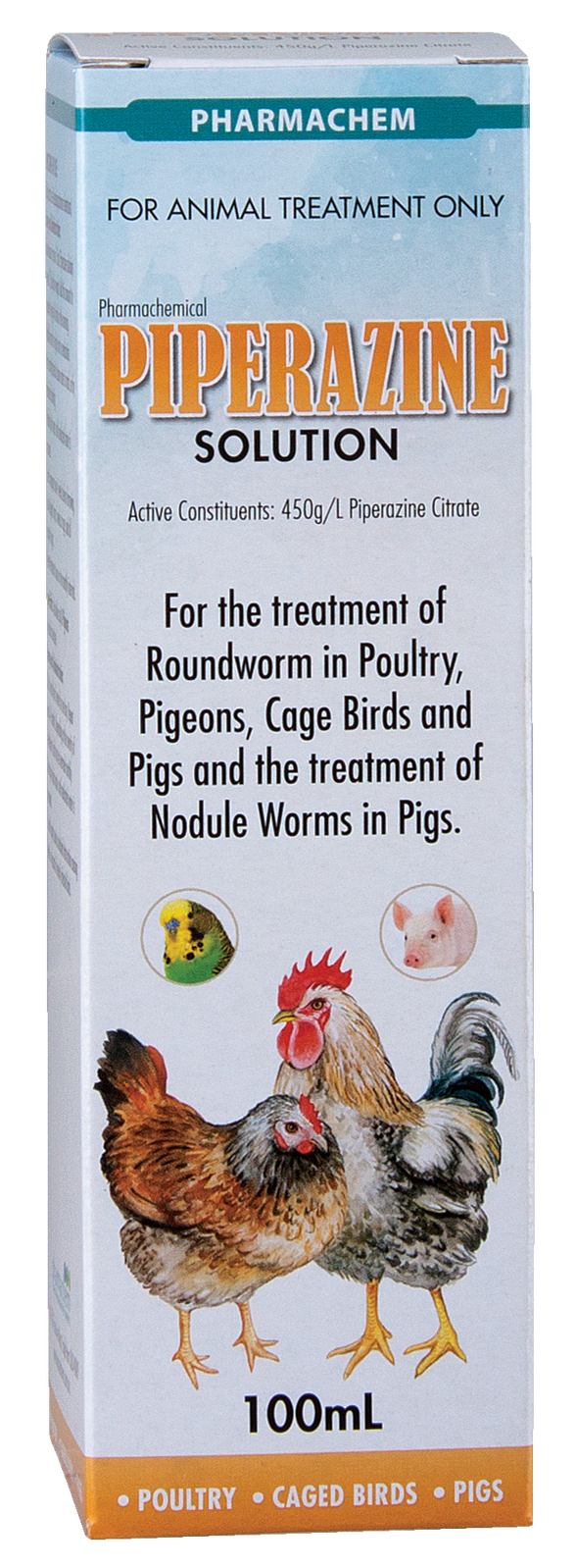 Piperazine Solution is an effective control of Roundworm in poultry, pigeons, cage birds and pigs. It is also an effective Nodule Wormer in pigs.