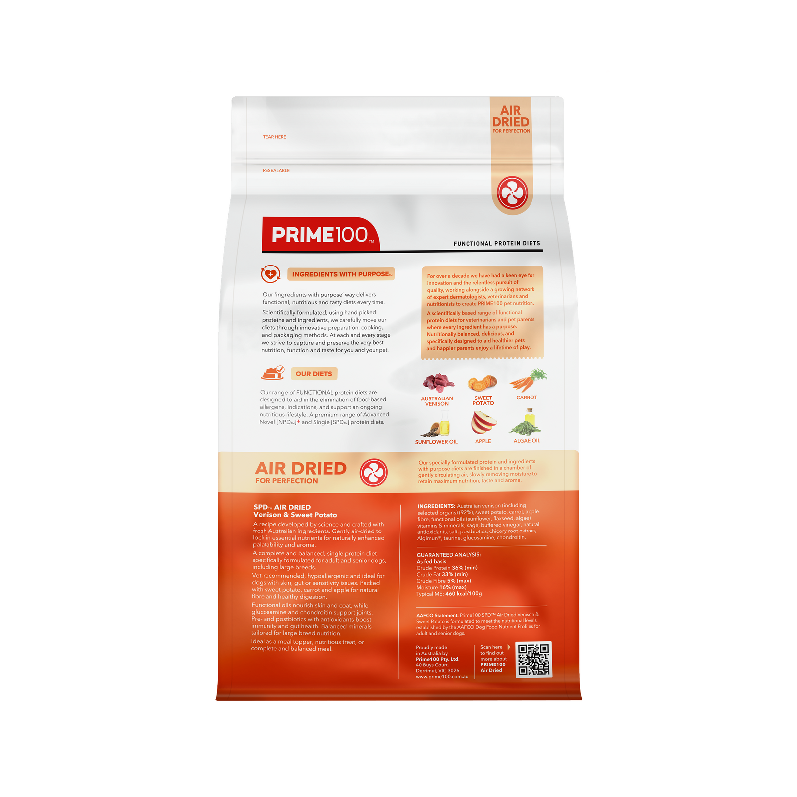 A recipe developed by science and crafted with fresh Australian ingredients. Prime100 SPD™ Air Dried Venison & Sweet Potato is gently air-dried to lock in essential nutrients, and for naturally enhanced palatability and aroma. A complete and balanced, single protein diet specifically formulated for adult and senior dogs, including large breeds.