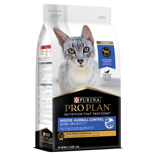 Pro Plan® Adult Cat, Indoor. Hairball Control, Chicken combines all essential nutrients including vitamins A, C and E, also Omega 3 and 6 Fatty Acids and a natural prebiotic in a high-quality diet for cats.