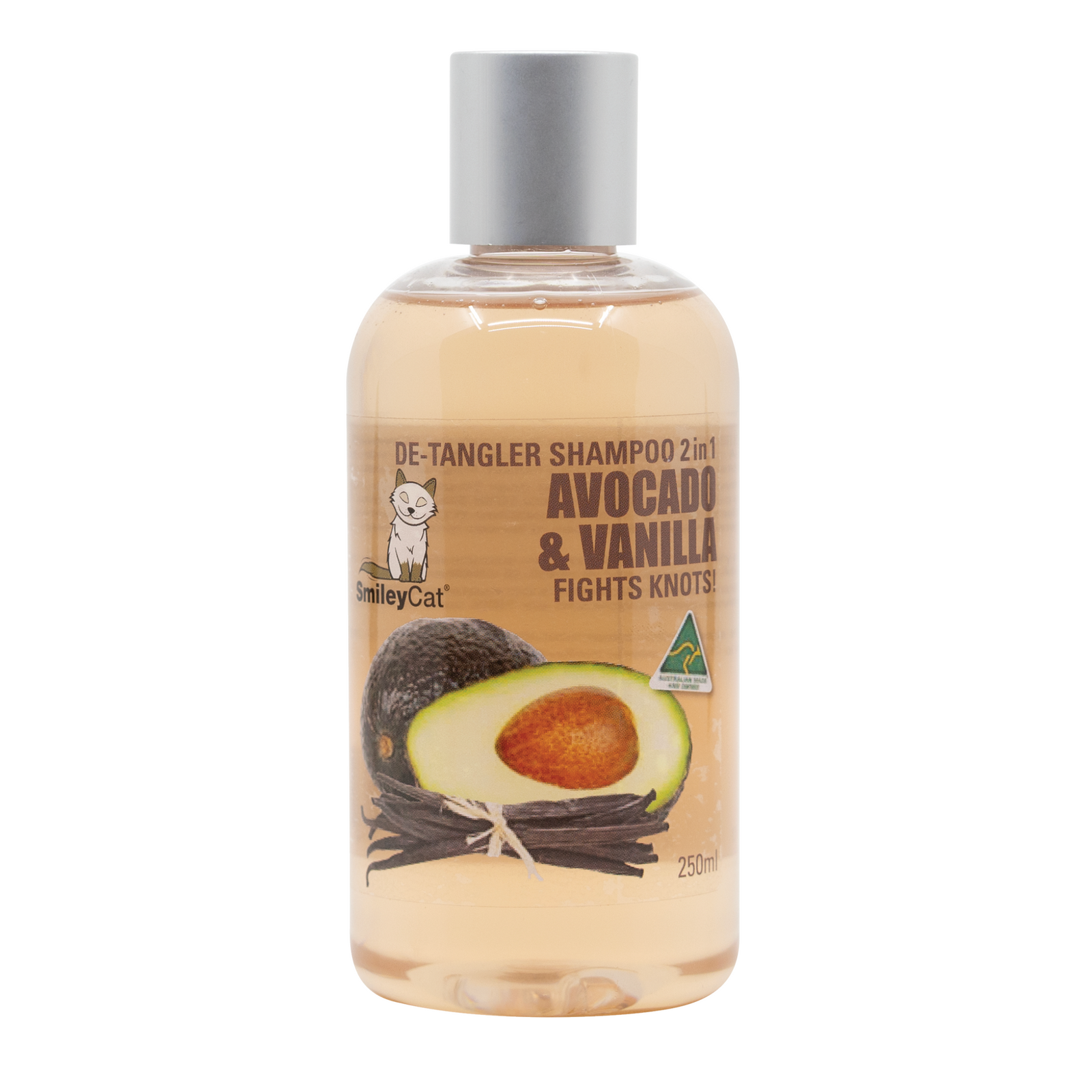 SmileyCat® De-tangler Shampoo 2 in 1, is soap free and is formulated to cleanse the coat and effectively remove knots, de-matt, de-shed, add volume, reduce static and aid faster drying. Leaves NO residue on coat. Yummy Vanilla fragrance provides a subtle, uplifting aroma. Suitable for use with long-term flea control treatments.