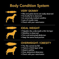 To maintain or promote an Ideal Body Condition, we recommend reducing the amount you feed your dog from the Standard amount to the recommended Ideal Body Condition amount. It may be necessary to adjust the level within this range to meet your dog’s ideal body condition.