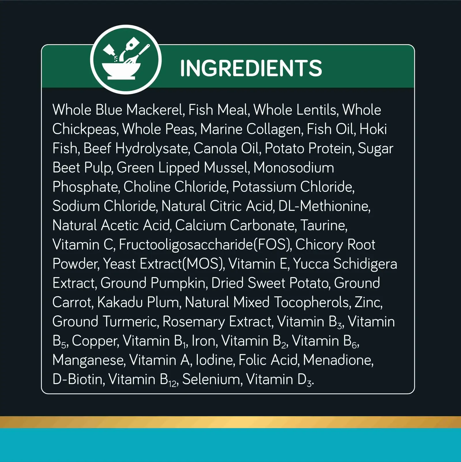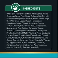75% Fish and Oils (Blue Mackerel and Hoki Fish, Wild-caught White Fish Meal, Marine Collagen, Premium Fish Oil and Canola Oil), a Broad Range of Fruits and Vegetables (Whole Lentils, Whole Chickpeas, Whole Peas, Potato Protein, Sugar Beet Pulp, Chicory Root Powder, Ground Pumpkin, Dried Sweet Potato, Ground Carrot, Kakadu Plum, and Rosemary Extract), Premium Beef Hydrolysate, Vitamins and Minerals, Green Lipped Mussel, Salt, FOS, Yeast Extract (MOS), Yucca Schidigera Extract, Natural Citric Acid, Natural Acetic Acid, Ground Turmeric.