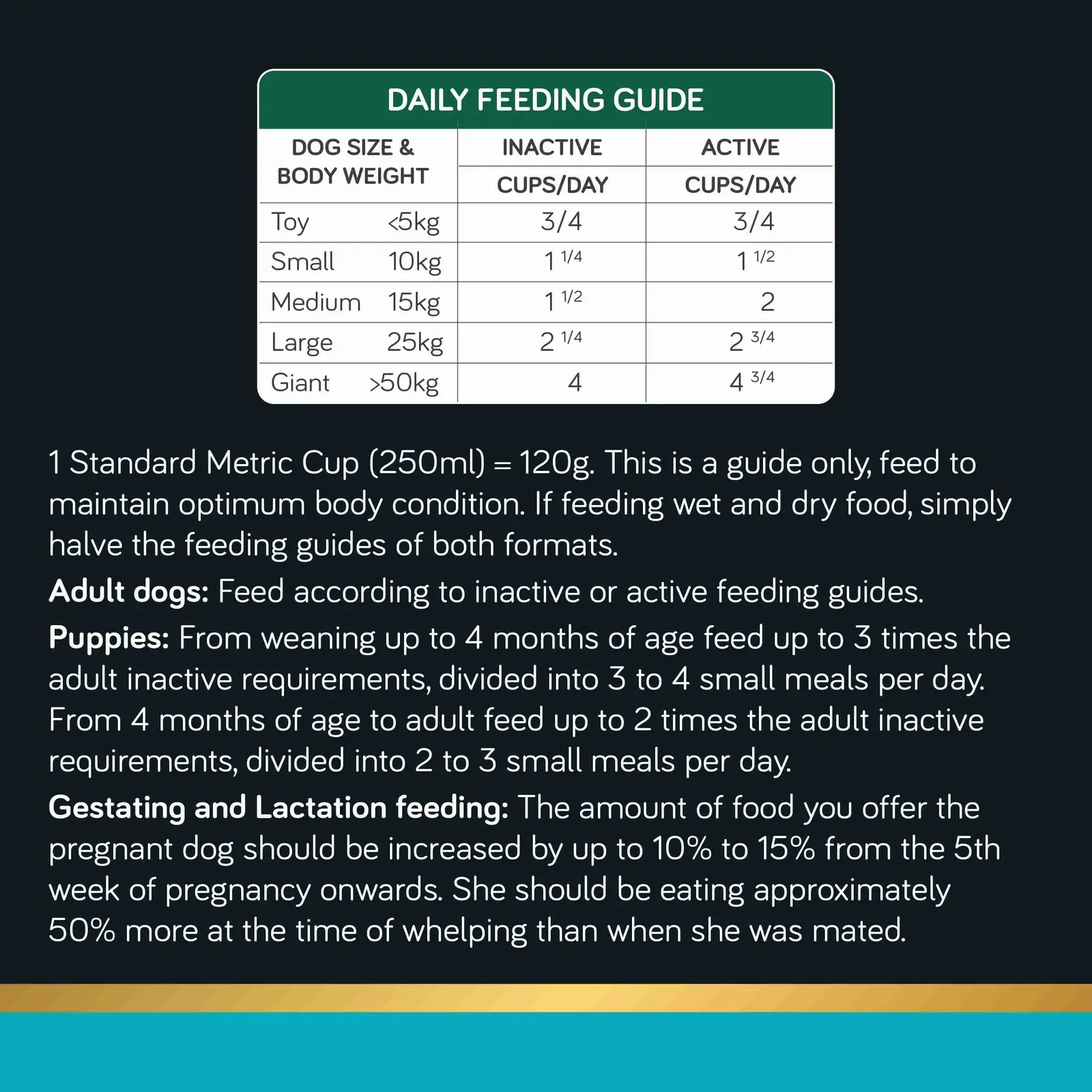 This is a guide only, feed to maintain optimum body condition. If feeding wet and dry food, simply halve the feeding guides of both formats.