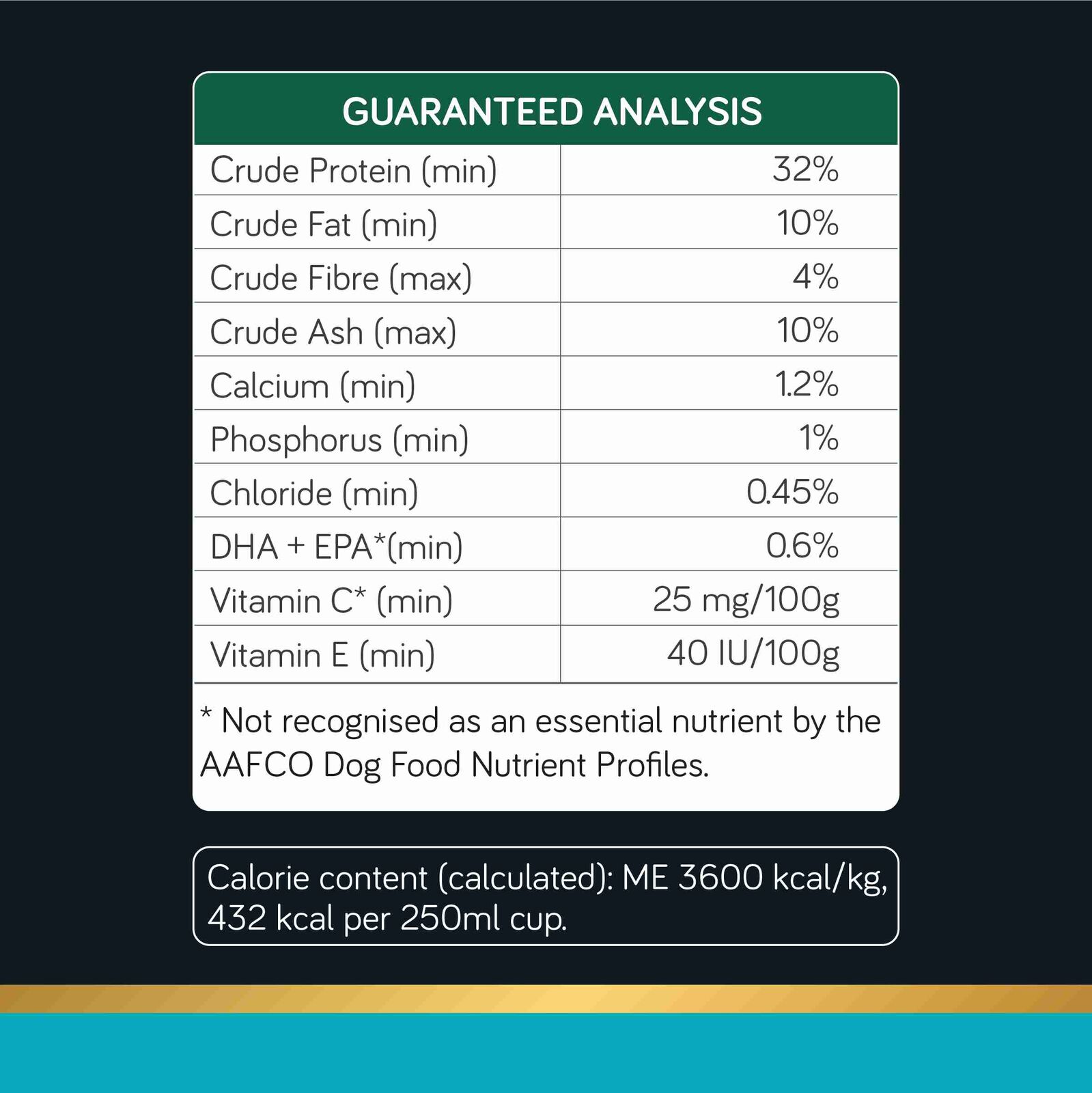 Calorie content (calculated): ME 3600 kcal/kg, 432 kcal per 250ml cup.