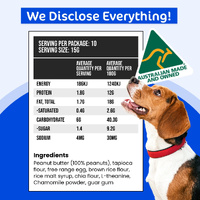 Peanut butter (100% peanuts), tapioca flour, free range egg, brown rice flour, rice malt syrup, chia flour, L-theanine, Chamomile powder, guar gum