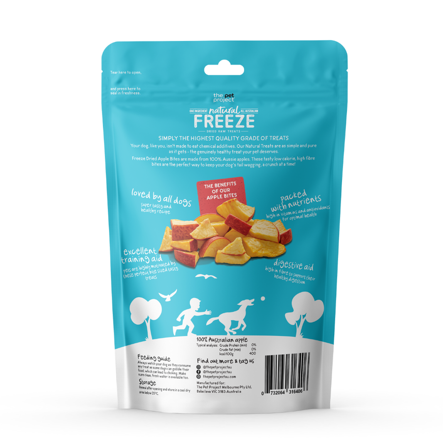 Our Apple Bites are made from only one ingredient - real Australian apples - gently freeze-dried into light, crunchy pieces that dogs love. With no additives, fillers or preservatives, it's a naturally sweet, fibre-rich treat you can feel good about giving every day.