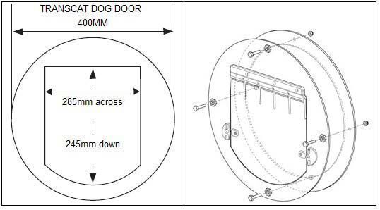 A circular hole is simply cut by a competent glazier and your Transcat Dog door fitted in the following manner: