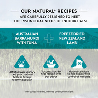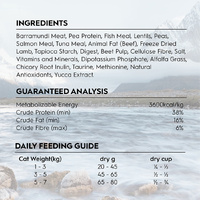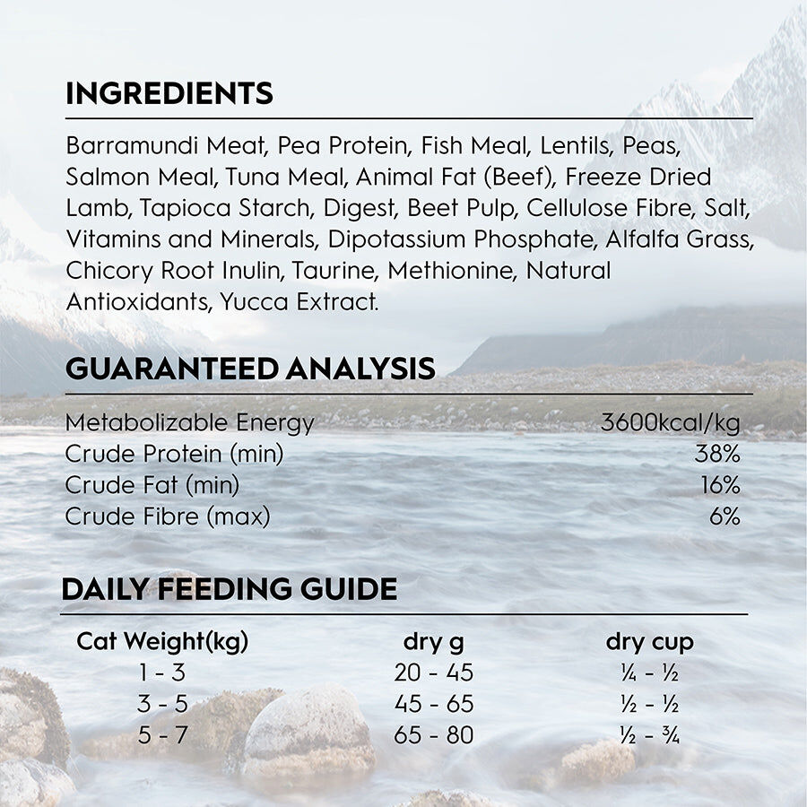 Barramundi meat, Pea Protein, Fish Meal, Lentils, Peas, Salmon meal, Tuna meal, Animal Fat (Beef), Freeze Dried Lamb, Tapioca Starch, Digest, Beet Pulp, Cellulose Fibre, Salt, Vitamins and Minerals, Dipotassium Phosphate, Alfalfa grass, Chicory Root Inulin, Taurine, Methionine , Nature Antioxidants, Yucca Extract.