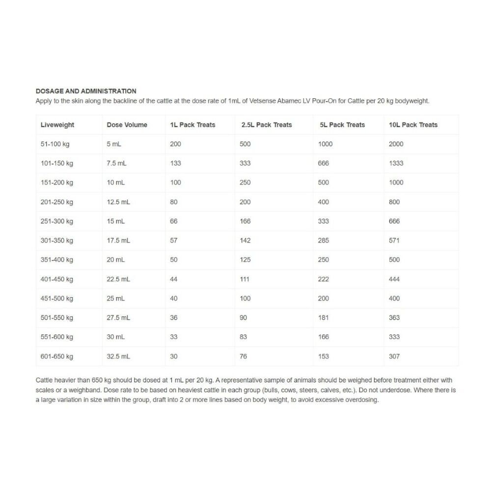 At the recommended dose rate, Vetsense Abamec LV Pour-On for Cattle effectively controls infection with Ostertagia spp. (Small brown stomach worm) acquired up to 14 days after treatment, with Dictyocaulus viviparus (Lungworm) acquired up to 28 days after treatment.