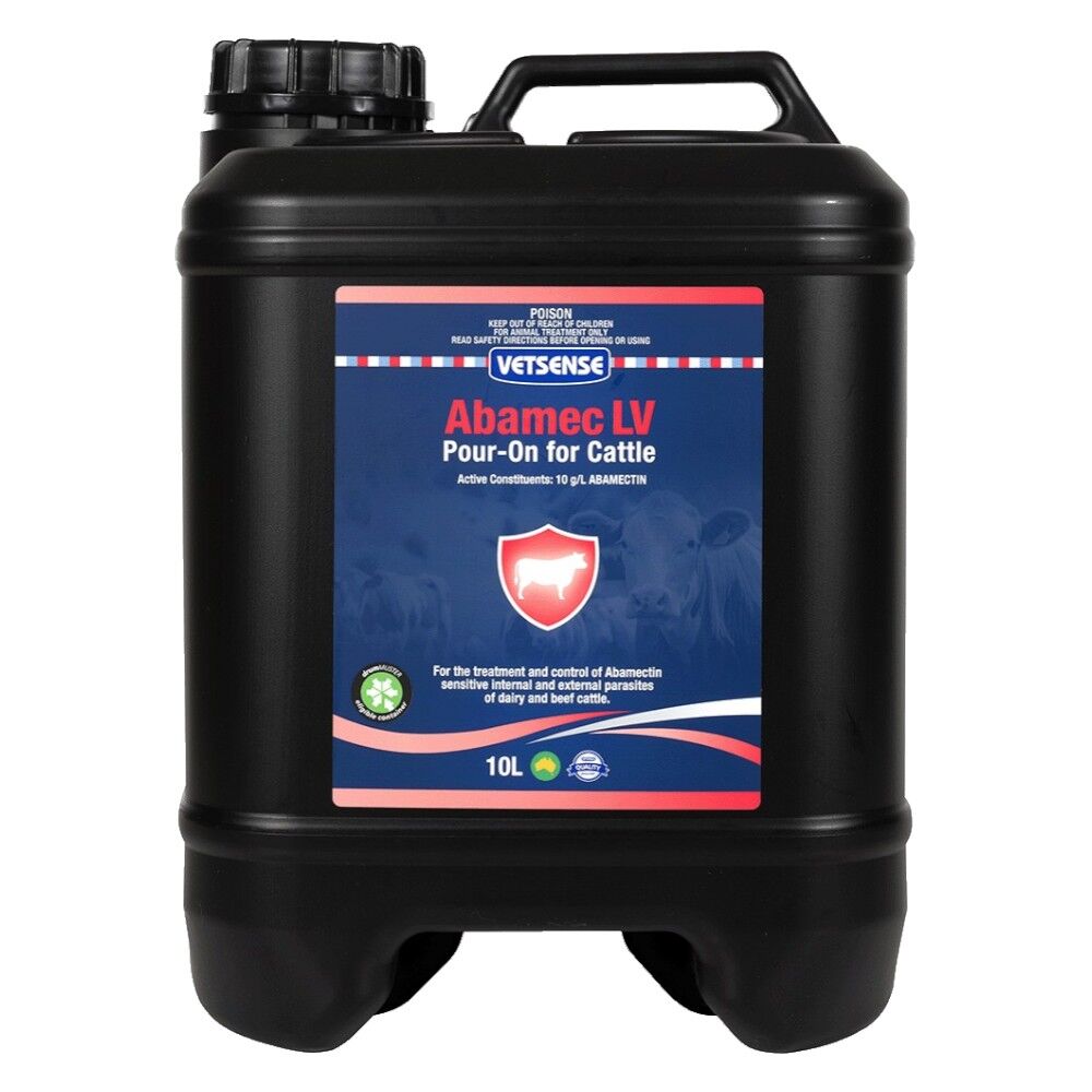 Vetsense Abamec LV Pour-On for Cattle is ideal for the treatment and control of Abamectin sensitive internal and external parasites of dairy and beef cattle. Contains Abamectin (10 g/L), a member of the macrocyclic lactones.