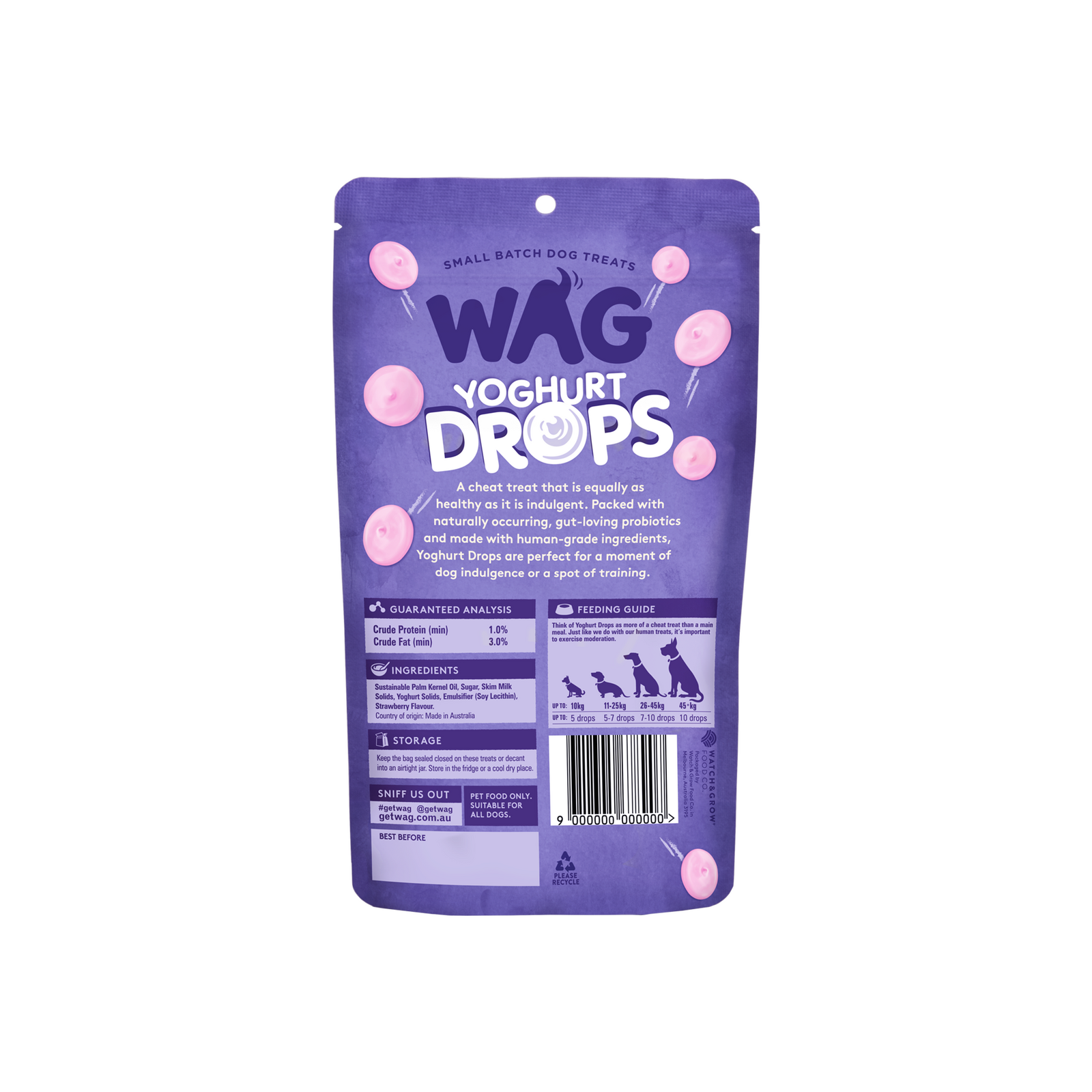 WAG Strawberry Yoghurt Drops are a delicious sweet snack your dog will love. This human-grade, bite-sized treat is the perfect size for training and offers doggos of all ages and sizes a cheat treat between meals. WAG Yoghurt Drops are full of gut-loving probiotics and natural ingredients.