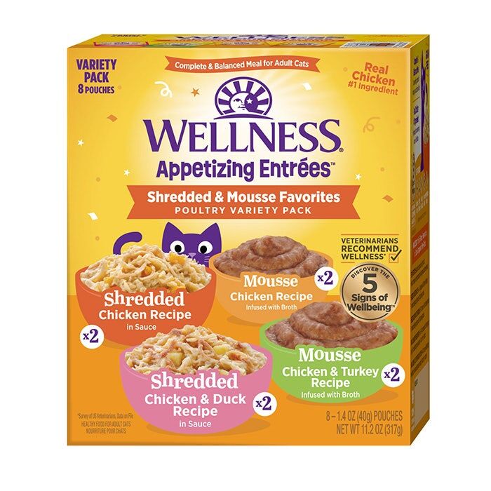 Wellness Appetizing Entrées Variety Pack features mouthwatering meals cats crave. Each delicious, protein-rich recipe is formulated for adult cats, features real protein as the #1 ingredient, and is crafted with high-quality, natural ingredients. Every pouch supports healthy hydration with delicious moisture-rich broth and has no added artificial flavors, preservatives, colors, or carrageenan.