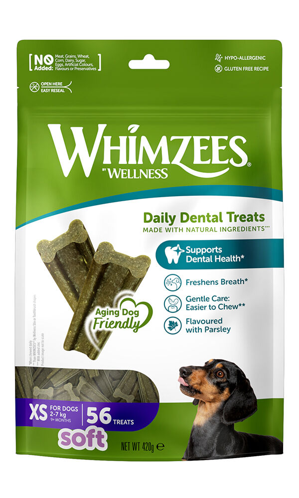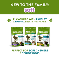 WHIMZEES® by Wellness Soft chews are 35% softer than our Adult Stix or Brushzees, which makes them easier to chew on, perfect for gentle chewers or senior dogs. Give your dog one WHIMZEES® per day and you're giving them a fun and healthy challenge!
