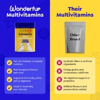 Wonderfur Daily Multivitamin for dogs and cats delivers a balanced blend of essential vitamins and minerals designed to support overall health and vitality. This 200g supplement promotes a strong immune system, healthy skin and coat, and optimal energy levels for both dogs and cats. Formulated to complement your pet's diet, it helps fill nutritional gaps, ensuring they receive daily nutritional support for a long, active life.